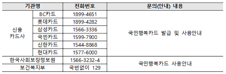 국민행복카드와 관련한 자세한 사항은 국민행복카드 누리집 또는 각 카드사 고객센터를 통해 확인할 수 있다.