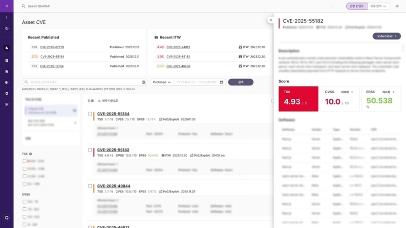 퀘이사 ASM은 ‘자산 탐지–자산 분석–지속 모니터링’의 3단계 프로세스로 구성된다. 차별화 요소는 S2W 위협인텔리전스센터 ‘탈론(TALON)’이 개발한 취약점 위험도 산정 체계 ‘탈론 스코어(TALON SCORE)’다. 기존의 EPSS나 CVSS가 기술적 심각도나 통계적 악용 가능성에 초점을 맞춘 반면 탈론 스코어는 접근 난이도, 실제 악용 사례, 공격 코드 존재 여부, 공개 시점 등 다양한 요소를 종합해 기업 환경에 최적화된 위험도 정보를 제공한다. 이를 통해 자산의 비즈니스 중요도와 운영 맥락을 반영한 우선순위 설정이 가능하다는 설명이다.
