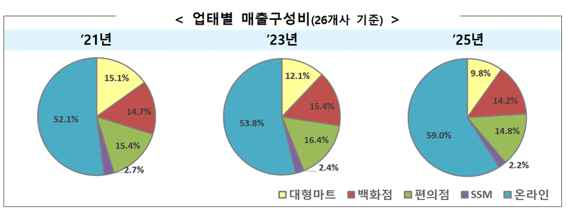 2021년부터 2025년까지 유통산업은 온라인 부문의 급격한 성장과 대형마트의 위축 현상을 보이며 변화했다. 온라인 매출은 연평균 10.1% 성장해 전체 유통에서 점유율이 지속 확대되어 2025년에는 59.0%에 달했다. 반면 오프라인 부문은 연평균 2.6% 성장에 그쳤으며, 대형마트는 연평균 매출이 4.2% 감소했다.