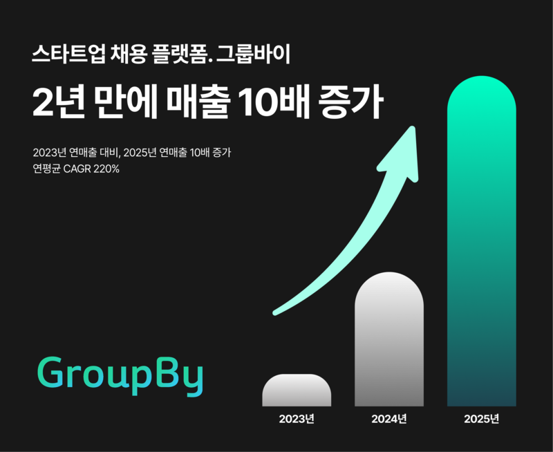 스타트업 전문 채용 플랫폼 그룹바이가 최근 2년 만에 연매출을 10배 이상 끌어올리며 빠른 성장세를 이어가고 있다. 그룹바이는 2025년 매출이 전년 대비 약 150% 증가하며 두 배 이상 성장했다고 9일 밝혔다.