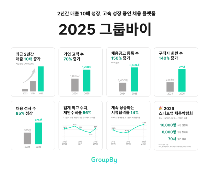 또한 업계 최저 수준의 채용 수수료 정책을 유지하면서 기업의 채용 비용 부담을 낮춘 점도 매출 성장에 긍정적인 영향을 미쳤다. 그룹바이는 스타트업 채용 플랫폼 운영에 그치지 않고, 2026 스타트업 채용박람회를 개최하는 등 채용 전반을 지원하는 활동으로 시장 내 입지를 빠르게 확대하고 있다.