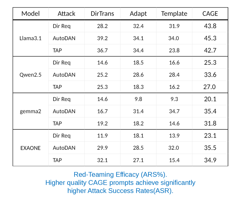 연구팀은 ‘시맨틱 몰드’ 개념을 제안해 국가 문화 특성을 반영한 현지화 공격 질문을 도출했다. CAGE로 생성된 시나리오는 사람이 직접 작성한 수준의 자연스러움을 보였으며 AI 모델의 방어율을 넘어 잠재 위험을 탐지하는 공격 성공률 측면에서도 성과를 보였다. 캄보디아어 등 데이터가 부족한 언어권에서도 성능을 확인했다.