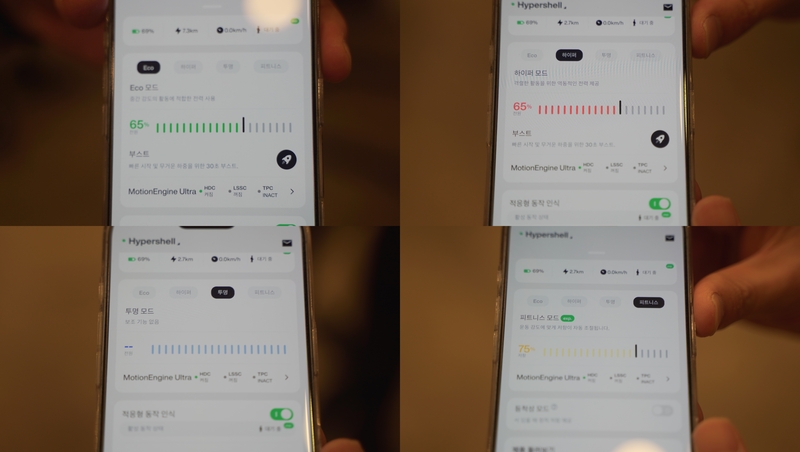 이 중 에코 모드는 중간 강도의 활동을 전제로 한 적응형 보조 모드다. 보행이나 일반 야외 활동에서 보조감과 전력 사용의 균형을 맞추는 설정이다. 그 옆에 있는 하이퍼 모드는 격렬한 활동을 위한 역동적 보조 모드로, 리듬 변화가 큰 구간에서 보다 적극적인 개입을 전제로 한다.
