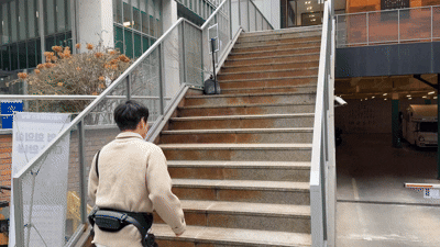 ▲ 계단을 오르내리는 과정에서 하이퍼쉘 X 울트라가 사용자의 활동을 보조한다. (촬영 : 브이디로보틱스 관계자, 편집 : 헬로티 최재규 기자)