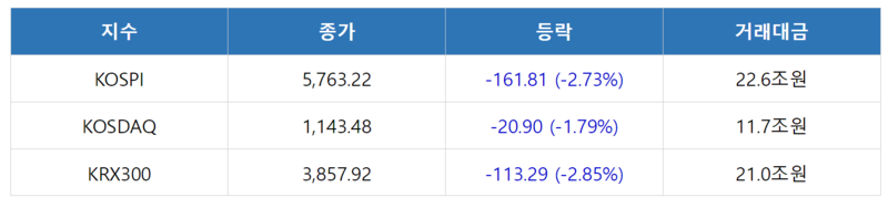 KOSPI는 전일 해외증시 약세 및 유가 급등 등으로 하락 출발하였으며, 아시아 증시 전반 약세를 보이는 가운데 반도체 관련주 중심으로 외국인·기관 동반 매도세가 출회되며 2%대 하락 마감했다. 4일 만에 하락이다. 대형주(-2.9%), 중형주(-1.4%), 소형주(-0.7%) 모두 약세를 보였다. 업종별로는 증권(-3.4%), 전기·전자(-3.4%), 운송장비·부품(-3.0%), 제약(-2.8%) 등이 하락을 주도했다. 투자자별로는 개인(+2조4,111억원)이 순매수한 반면 외국인(-1조8,825억원)과 기관(-6,659억원)은 대규모 순매도했다.
