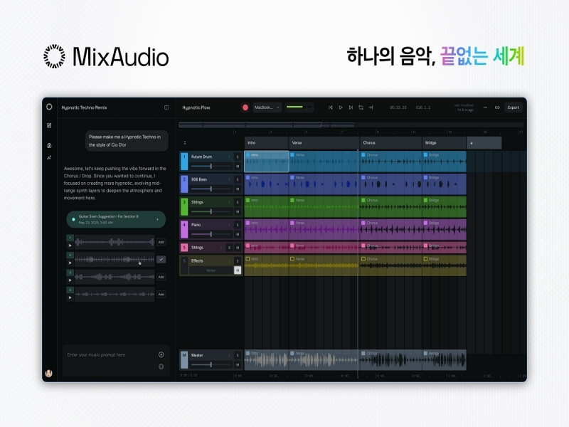 그는 정통성과 확산이 충돌하는 개념이 아니라고 봤다. “정통성을 충분히 존중하는 것을 전제로, 표준화와 확산을 통해 더 많은 접점을 만드는 것이 목표입니다. 케이팝이 확산되면서 오히려 한국 문화에 대한 인식이 넓어진 것처럼 국악도 그런 경로를 걸어갈 수 있다고 봅니다.” 2026년 2분기 출시 예정인 에이전트형 AI 리믹스 서비스 '믹스오디오(MixAudio)'는 K-팝, 국악, EDM을 중심으로 한국 음악 콘텐츠의 글로벌 확산 가능성을 직접 실험하는 장이 될 것이다.