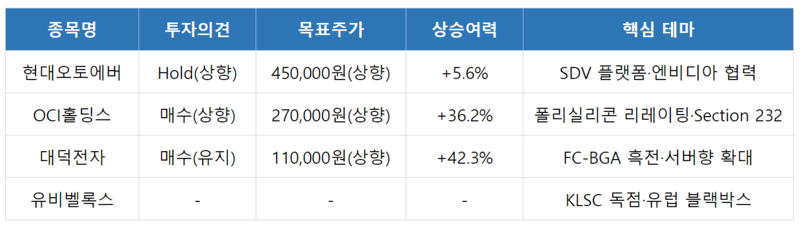 비차량 사업 부문에서도 성장이 가시화되고 있다. AI팩토리(스마트팩토리·MES) 및 로봇SI 사업이 본격화되며 신성장 동력으로 부상 중이다. 2026년 실적 전망은 매출액 4조8,350억원(+13.7%), 영업이익 3,000억원(+17.6%)이다. 다만 Valuation 부담(PER 32배)으로 인해 투자의견은 Hold를 유지했다.