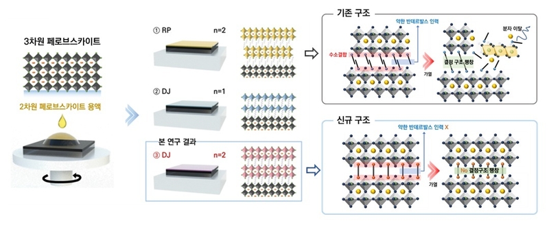 KAIST 생명화학공학과 서장원 석좌교수 연구팀은 한국화학연구원과 공동으로 2차원 보호막 설계 기술을 개발했다고 24일 밝혔다. 이 기술은 페로브스카이트 층 사이를 강한 유기 분자가 연결하는 ‘디온–재콥슨(DJ) 구조’를 적용해 구조적 안정성을 크게 높였다.