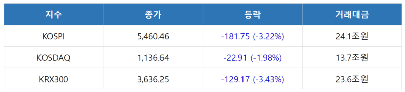 KOSPI는 전일 해외증시 강세에도 반도체 업황 불확실성 등 영향으로 하락 출발한 가운데, 장중 미국·이란 평화협상 불확실성이 지속되는 가운데 반도체 관련주 중심으로 외국인·기관의 동반 매도세가 확대되며 3%대 하락 마감했다. 3일 만에 하락이다. 대형주(-3.5%)가 가장 큰 낙폭을 보였으며 중형주(-1.3%), 소형주(-1.1%) 순으로 약세를 보였다. 업종별로는 전기·전자(-4.8%), 보험(-4.7%), 건설(-3.6%), 증권(-3.2%) 등이 하락을 주도했다. 투자자별로는 개인(+3조598억원)이 순매수한 반면 외국인(-3조1,110억원)과 기관(-3,390억원)은 순매도했다.