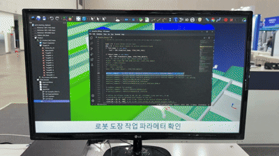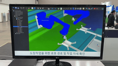 ▲ 가상 환경에서 코봇을 활용한 도장 공정을 검증하고 있다. (촬영·편집 : 헬로티 최재규 기자)