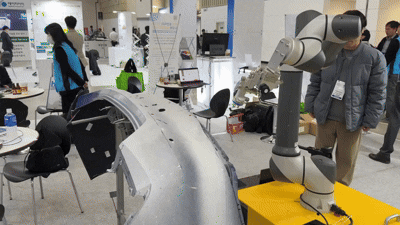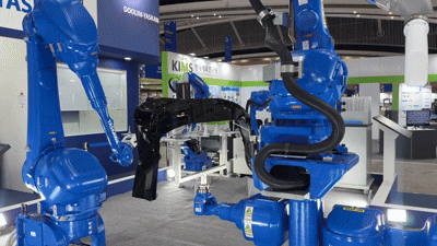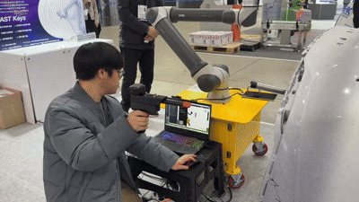 이러한 구조적 특징을 통해 도료 도달이 어려운 은폐 부위를 최소화하고, 낮은 구동 속도에서도 더 높은 도장 품질을 확보할 수 있다는 것이 회사 측의 설명이다. 현장에서는 모토피더 상단에 산업용 로봇이 탑재된 협조 도장 형태의 솔루션이 시연됐다. 김 책임에 따르면, 도장 로봇 두 대와 모토피더 한 대를 결합한 총 3대 규모의 협조 도장까지 구현 가능하다.