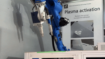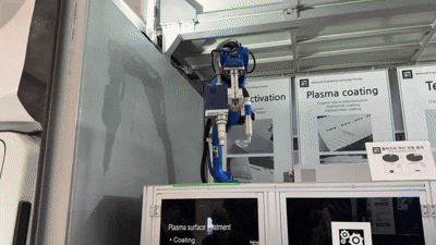 현장에서는 시편 표면에 스티커를 부착하기 전, 로봇 기반 플라즈마 자동화 시스템을 통해 접착 유지력을 극대화하고 표면 유기물 및 오염물질을 제거하는 시연을 진행했다. 해당 기술은 코팅·도장·접착 등의 전처리 단계에 동일하게 적용돼 최종 품질의 안정성을 확보하는 역할을 한다.