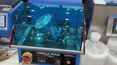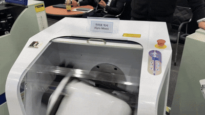 현장에는 ‘자이로 믹서(Gyro Mixer)’와 ‘터뷸라 믹서(Turbula Mixer)’가 전면 배치됐다. 이 중 자이로 믹서는 대용량 용기를 고정한 채 강력한 3차원(3D) 입체 회전으로 내용물을 균일하게 섞는 장비다. 현장 대응력을 높인 설계가 특징이다. 자동 고정(Clamping)과 3단 속도 선택 기능을 갖췄고, 슬라이딩 선반과 전자식 믹싱 타이머를 탑재해 정밀도를 높였다. 여기에 내장형(On-board) 진단 기능과 온라인 모니터링 옵션을 더해, 혼합 이력까지 데이터로 관리하는 스마트 공정 규격도 탑재했다. 적재 하중은 일반형 최대 40kg, 연구소용인 랩(Lab) 버전은 30kg까지 지원한다.