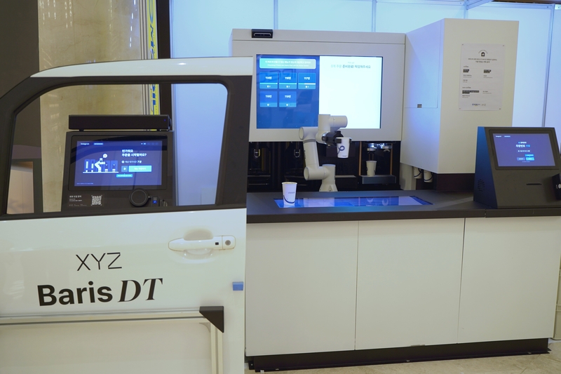 기자는 엑스와이지 전시 현장을 방문해 바리스 DT를 경험했다. 여기에는 직립형 무인 단말기(Kiosk)와 차량 구조물이 배치됐고, 참관객이 차 안에서 주문하는 상황을 연출했다. 이 시스템은 키오스크에 탑재된 엑스와이지 AI 음성 주문 기능 ‘보이스오더(Voice Order)’와 바리스타 로봇 플랫폼 ‘바리스브루(Baris Brew)’가 융합된 형태다. 사용자는 키오스크와 대화하며 메뉴를 고르고, 바리스브루 픽업 존에서 로봇 팔(Robot Arm)이 전달하는 음료를 받는다.