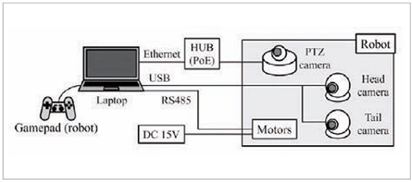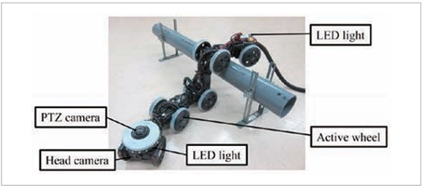 주요 개량점은 관절 수의 절감(경량화), 양쪽 바퀴의 능동화(주파성 향상), 바퀴 고무부에 그로서 추가(바퀴 미끄럼 방지), 양 끝에 LED 라이트 탑재(어두운 곳 대응), 점검용 카메라 추가(정보 수집 능력 강화), 마이크로 컴퓨터와 센서를 제거(시스템 간략화), 유선화(동작 불능 시의 기체 회수에 이용) 등이다. 로봇을 포함한 시스템 전체를 그림 2에 나타냈다. 로봇의 선두와 최후미에는 이동 시의 시야 확보용 카메라가 각각 탑재되어 있으며, 선두에는 팬·틸트·줌 기능을 가진 PTZ 카메라가 탑재되어 있다. 또한 모터 전원인 DC15V는 유선으로 공급된다.