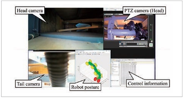 • 이상 상태에서 복귀 : 스택이나 옆으로 넘어짐, 유선 케이블의 엉킴에 대처해 동작을 계속할 수 있었다. 이것은 3차원 기본 조타의 비틀기 동작, 탈력에 의한 환경 적응, 진행파 동작 등과 같은 이상시용 동작 수단이 포함되어 있었고, PTZ 카메라를 이용해 상황을 파악할 수 있었기 때문이다.