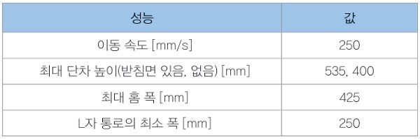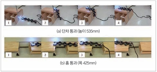 로봇의 이동 성능 평가 실험 모습을 그림 4에, 실험 결과를 표 2에 나타냈다. 제어 방법으로는 3차원 기본 조타를 이용하고, 오퍼레이터는 육안으로 동작 지시를 했다. 로봇의 전체 길이 824mm인 것에 대해 높이 535mm의 단차를 넘을 수 있었다. 이것은 로봇의 전체 길이로 정규화하면 65%이며, T² Snake-3의 60%와 거의 동등한 성능이다. 이처럼 우수한 장애물 극복 성능을 갖추고 있다고 할 수 있다.