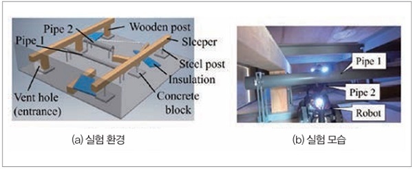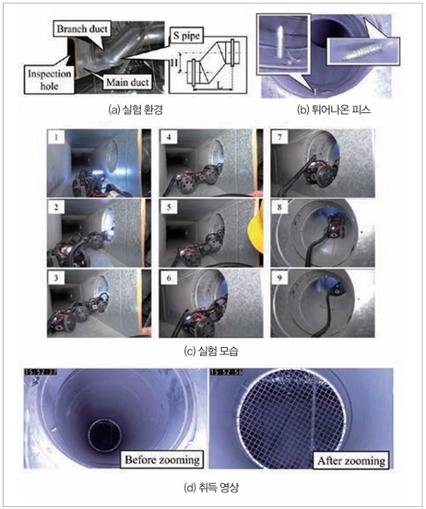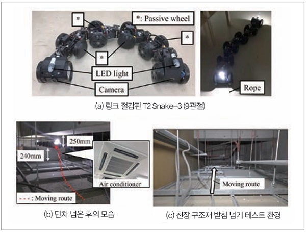 이동 능력으로는 그림 5(b)에 나타냈듯이 높이 20mm의 천장 구조재와 240mm의 단차를 넘고, 공조 상부의 좁은 부위(높이 250mm)에 진입할 수 있었다. 또한 높이 60mm의 천장 구조재 받침(그림 5(c))도 문제없이 넘었다. 로봇이 아래쪽 면의 석고보드를 파손하지도 않았다. 점검 능력으로는 슬래브면을 촬영한 영상이 불선명하고 불충분했다.