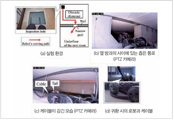 모델하우스 실험에서 로봇이 지나는 이동 경로를 그림 8(a)에 나타냈다. 포장 상태의 로봇과 주변 기기의 세트업 시간은 작업자 1명으로 13분이었다. 로봇은 바닥 밑을 진행해 그림 8(b)에 나타낸 높이 10cm의 단차를 넘어 옆 방의 바닥 밑에 진입했다. 그 후 로봇은 전진 불가능하게 되었다. 이것은 유선 케이블이 금속제의 바닥 받침에 걸렸던 것이 원인이다. 그래서 PTZ 카메라로 상황을 보면서 귀환했다. 걸려서 케이블을 당길 수 없었기 때문에 그림 8(c), 그림 8(d)에 나타냈듯이 귀환 시에 로봇과 유선 케이블의 감김 현상이 발생했다. PTZ 카메라로 상태를 파악하면서 신중히 조종함으로써 투입구로 귀환할 수 있었다.