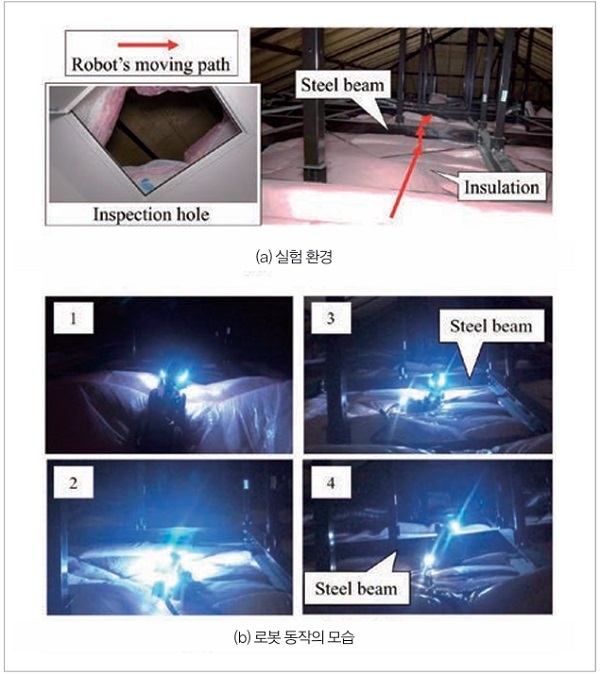그림 9(a)는 도시 내 모델하우스의 천장 안이다. 철골 뼈대 사이에 유연한 단열재가 깔려 있다. 단열재는 얇은 투명의 봉지에 들어 있다. 이 실험의 목적은 유연한 단열재 위의 동작과 철골을 넘을 수 있는지의 검증이다.