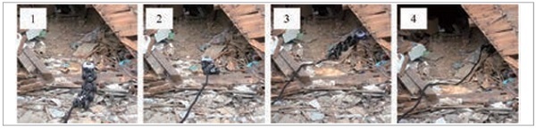 2018년 서일본 호우에 의한 산사태 현장의 전파 주택(오카야마현 한다야마(岡山県 半田山))에서 탐색을 했다. 대상 주택은 2차 붕괴 위험이 있어 사람이 접근할 수 없었다. 그림 10에 나타냈듯이 목재를 넘어 붕괴 주택의 내부에 진입해 조사를 했다. 로봇은 재해 현장의 분진 환경에서도 문제없이 동작했고, 선두 PTZ 카메라로 선명한 잔해 내 영상을 얻을 수 있었다. 그러나 바퀴 공전이 자주 발생해 등반에 긴 시간이 걸렸다. 이것은 로봇이 개량 전이고 바퀴에 그로서가 없었던 것이 원인이었다.