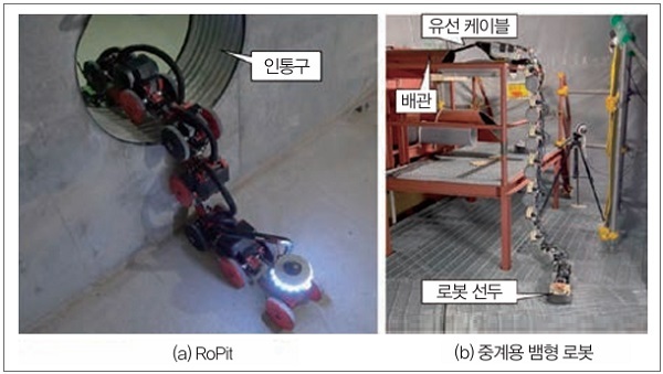 그림 11(a)에 나타낸 RoPit은 맨션 지하 피트의 자동 점검을 목적으로 한 다연결 이동 로봇이다. 맨션의 지하 피트는 창문이 없고 사방이 콘크리트로 둘러싸인 좁은 공간으로, 사람이 점검하는 경우는 부담이 크고 또한 산소 결핍 등의 위험이 있다. 지하 피트는 배수로와 장애물이 곳곳에 존재하는 여러 개의 방이 인통구라고 불리는 구멍을 통해 서로 연결되어 있으며, 점검 시에는 인통구를 통과하여 방 사이를 이동한다. 인통구는 직경 60cm 정도의 원통형으로, 지상면에서 떨어진 높은 위치에 존재하는 경우도 많다. 지하 피트를 점검하는 로봇에는 좁은 부위를 이동하기 위한 좁은 장소 진입 성능, 인통구를 통과하기 위한 장애물 통과 성능, 무선이 닿지 않는 환경의 자율 이동, 장시간 가동이 요구된다. 이러한 요구를 만족시키는 로봇으로 자율 이동형 다연결 이동 로봇을 제안해 현장 시험을 진행하고 있다. 이 로봇은 앞에서 얻은 교훈을 활용해 PTZ 카메라와 그로서 부착 바퀴가 탑재되어 있다.