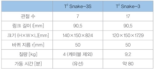 다연결 이동 로봇 T² Snake-3S를 그림 1에 나타냈다. 구조는 요 회전 관절과 피치 회전 관절을 교대로 연결한 관절 구성이며, 바퀴가 피치 관절과 동축상에 배치되어 있다. 이 로봇은 문헌 「Development and Control of Articulated Mobile Robot for Climbing Steep Stairs」의 T² Snake-3을 좁은 장소용으로 개량한 것이다. 제원을 표 1에 나타냈다.