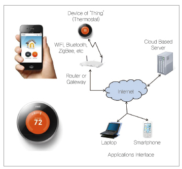 사물인터넷의 대표적인 사례는 2014년 초, 구글이 인수해 화제가 된 Nest社의 온도조절기이다(그림 2). 미국 가정에서 흔히 볼 수 있는 온도조절기에 학습 기능을 탑재하고 네트워크로 연결하여, 사람이 개입하지 않아도 스스로 판단하여 온도를 조절함으로써 쾌적한 환경을 제공하고 에너지 소비를 저감하는 제품이다.