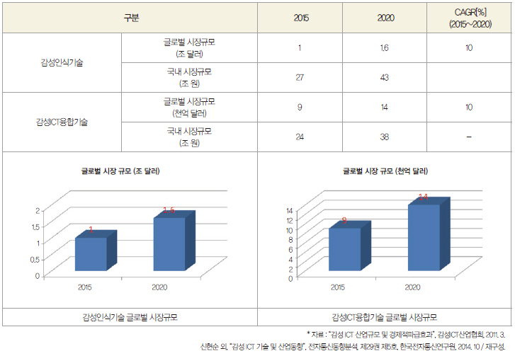 감성인식기술 분야의 글로벌 시장은 2015년 1조 달러에서 연평균 10%의 높은 성장을 지속해 2020년에는 1조 6,000억 달러에 이르는 초대형 파이를 형성할 것으로 예상하고 있다. 국내 시장도 2015년 27조원에서 2020년에는 43조원 규모로 성장할 것이란 예측이다.