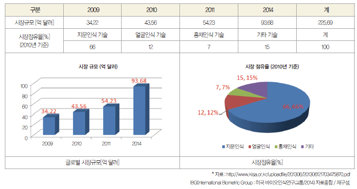 세부 기술별로는 2010년 기준 지문인식기술이 28억7천만 달러로 전체 시장의 66%의 절대적인 비중을 차지하고 있으며, 얼굴인식기술은 5억1천만 달러(전체시장의 12%), 홍채인식기술의 경우 2억9천만 달러(전체시장의 7%)를 기록했다[6][7]. <표 3>은 바이오인식기술 관련 전방위 기술 분야의 글로벌 시장 규모 추이이다.
