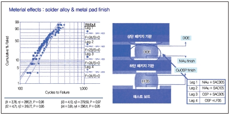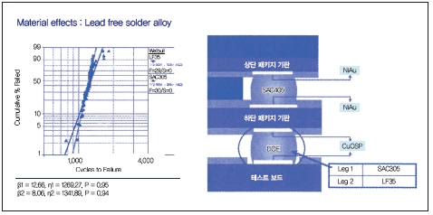 이번 테스트의 상단 패키지는 12×12㎜, I/O : 128, 0.65㎜ Pitch의 조건으로 구성했으며, 하단 패키지는 12×12㎜, I/O : 305, 0.5㎜ Pitch에 LF35 솔더를 사용하고 NiAu/CuOSP pad finish 처리했다.