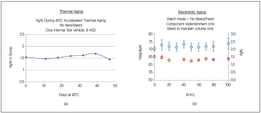 도금 약품에 대한 공정 온도, 전류 밀도 및 기타 파라미터는 약품의 성능에도 영향을 줄 수 있다. 하지만 이 역시 제품의 유연성 문제로 다시 돌아오게 된다. 앞서 언급했듯이, 이 도금 약품의 개발 목표 중 하나는 기존에 출시된 다른 도금 약품에 비해 매우 넓은 관리 범위에서 동작해야 한다는 점이었다. 약품에 대한 열 노화 성질(Ther-mal Aging)을 실험한 결과, 40°C에서 6주 이상 보관 후 도금 시에도 안정적인 Ag 조성이 유지됨은 물론 Bump의 매끄러운 형태가 유지되고 보이드가 발견되지 않는 것을 확인할 수 있었다.