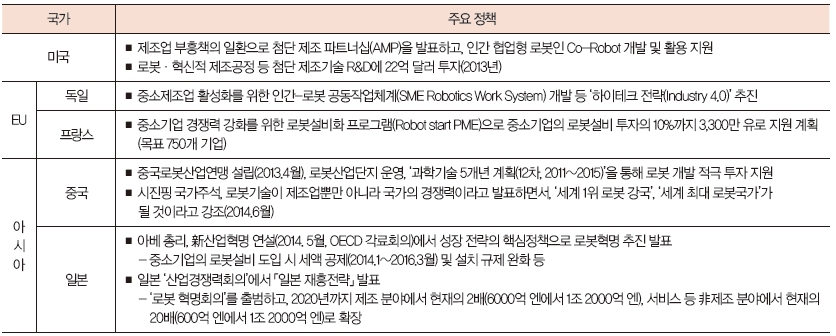 현재 세계 각국은 침체된 자국 제조업 부흥을 위한 정책을 추진 중이며, 특히 제조업용 로봇 도입의 긍정적 효과를 바탕으로 로봇 활용을 촉진하는 다양한 정책을 추진 중이다.