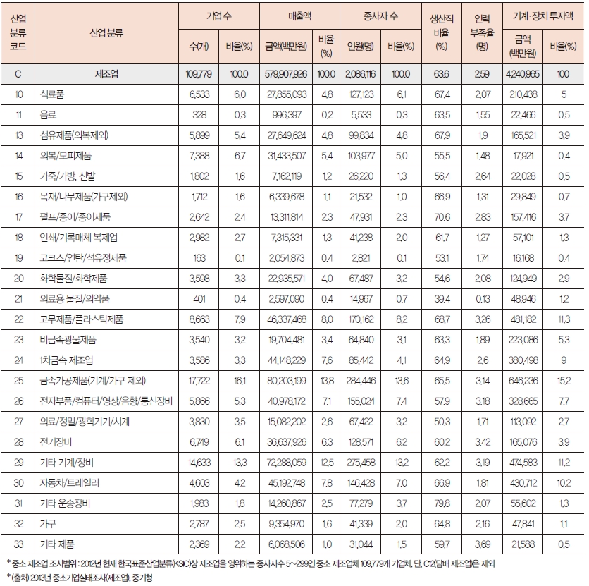 우리 경제 내 중소 제조업의 비중은 사업체 수 기준으로 1973년 93.9%에서 2009년 99.0%로 확대되었고 종사자 수 기준으로는 1973년 42.6%에서 2009년 73.5%로 크게 확대되었다. 부가가치 기준으로도 중소 제조업의 비중은 1973년 33.7%에서 2009년 48.2%로 확대되었다.
