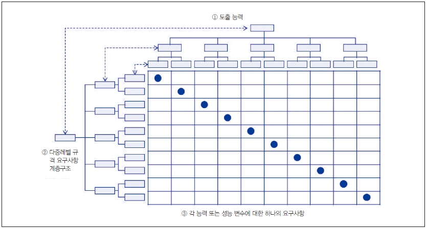 이상적으로 공식적인 사업제안서(RFP) 요청 시, 초기 시스템 요구문서(SRD), 시스템 성능 규격(SPS) 및 개체 품목 개발규격은 요구사항 문장으로 요구된 제안 솔루션 능력을 식별하고 외형적으로 표현한다. 일반적으로 요구사항과 요구능력 사이에 일대일 연계가 되어야 한다. 가장 좋은 사례는 그림 1에서와 같이 하나의 능력에 대하여 오직 한 가지 요구사항으로 요구규격으로 기술되는 것이 바람직하다.