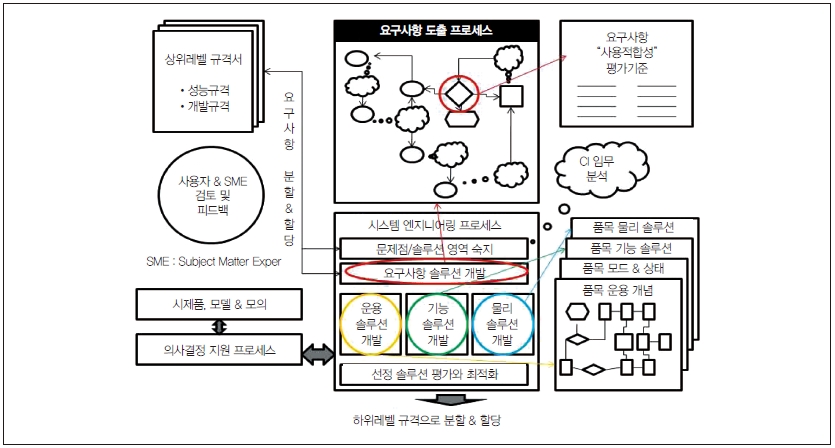 그림 3의 상단에 그려진 요구사항 도출 프로세스는 SE 프로세스 모델 내에서의 ‘요구사항 도메인 솔루션 개발’의 한 부분이다.