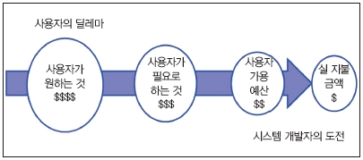 상위레벨 규격서로부터 요구사항을 분할하는 것은 획득자 또는 상위레벨 시스템 개발팀이 무엇을 원하는지를 나타내는 것이다. 요구사항 도출 프로세스는 그림 4에서와 같이 사용자가 원하는 것과 필요로 하는 것, 얼마나 예산이 가용한지와 기꺼이 지급하고자 하는 금액이 얼마인지를 조정해야 한다.
