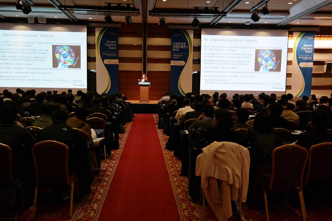독일 프랑크푸르트연구소 Carmon Constantinescu IAO 부원장이 독일의 인더스트리4.0과 R&D 현황에 대해, 서울대 손욱 원장은 국내 제조기업의 제조혁신 방향을, 로크웰 오토메이션 John Nesi 부사장은 초연결을 통한 고효율의 매뉴팩처링, PLM 컨소시엄 김태환 회장은 PLM을 통한 스마트 공장 도입 및 생산성 향상, 이플랜 Maximilian Brandl 대표는 독일의 스마트공장 도입 사례에 대해 강의하는 등 연일 핫이슈를 쏟아냈다.