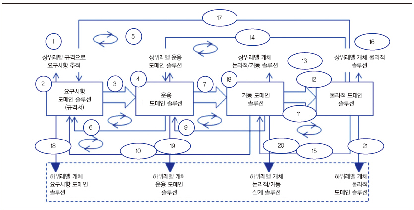 다중 레벨 거동 도메인 솔루션 연관성은 고도로 반복적인 활동을 통해 이루어진다. 그림 1의 개체 및 품목 시스템엔지니어링 설계 프로세스에서와 같이 요구사항, 운용 및 물리적 도메인 솔루션과 밀접한 협조와 협력을 요구하고 있다.
