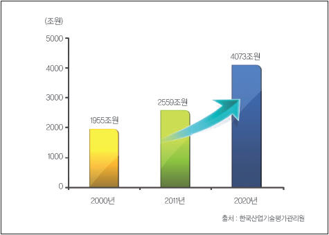 세계 뿌리산업 시장은 2011년 기준 2559조원 규모를 기록했으며, 연 3.7%대의 성장세를 유지하고 있다(그림 1). 2020년에는 디스플레이, 반도체 등 전방산업의 견인으로 인해 4073조원 규모까지 성장할 전망이다.