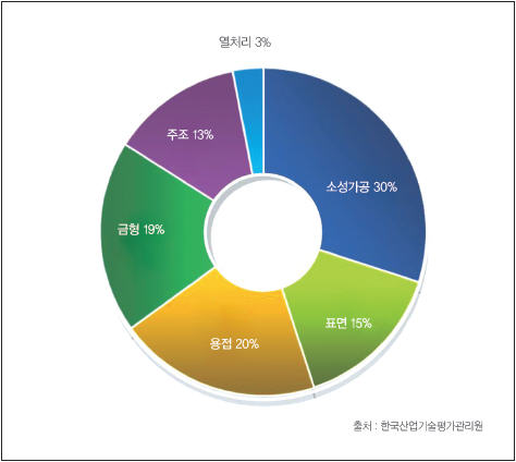 뿌리산업 시장에서 가장 많은 비중을 차지하는 것은 약 30%를 차지하는 소성가공 분야다(그림 2). 그 뒤를 용접(20%), 금형(19%), 표면(15%), 주조(13%), 열처리(3%)가 따르고 있다. 최근에는 휴대용 전자기기, 보호 기능용 외장품 등이 경량화, 내마모성 등 임계성능을 요구하면서 표면처리 시장이 급부상하는 추세다.