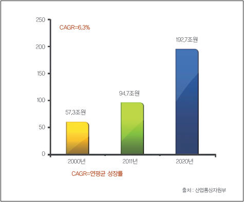 국내 뿌리산업 시장은 2011년 기준으로 시장 규모 94조 7천억원과 총생산 41조 7천억원을 기록했다. 2020년에는 192조 7천억원 규모까지 성장해 연평균 6.3%의 성장률을 보일 전망이다(그림 4).