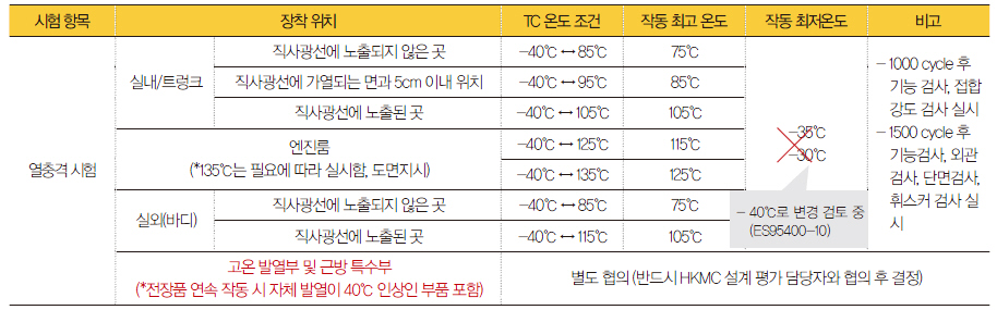 온도 싸이클 시험(TC, Tempera-ture Cycle)은 장착 위치별 온도 조건에 따라 비작동 상태에서 1000싸이클 시험을 실시하며, 온도 조건은 ES 95400-10에 준한다.