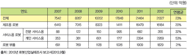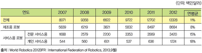 2012년 세계 로봇 시장 추산 규모는 133억달러로 2007년부터 2012년까지 5년동안 연평균 11%의 성장을 보였다(표 1).