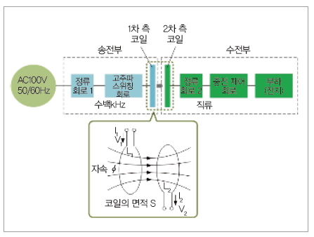 전력전송의 회로는 그림 1과 같이 정류회로 1에 의해 만들어진 직류를 스위칭 회로에 의한 고주파 교류 전류 I1 을 만들어 1차 코일 L1 에 전달한다. 여기서 발생된 교류 자속은 2차 코일 L2에 유도되어 기전력 V2를 발생하게 된다. 고효율 전송을 위해서는 코일 간격을 가능한 근접시킬 필요가 있다. 회로의 구성 요소가 일반적인 스위칭 전원에 사용되는 고주파 전원 트랜스와 같기 때문에 회로 구현 방법이 기술적으로 어렵지 않으며, 동작 원리는 패러데이(Faraday) 전자유도법칙으로 기술적 제원이 확립되어 있어 안전성이 있는 설계가 가능하다.