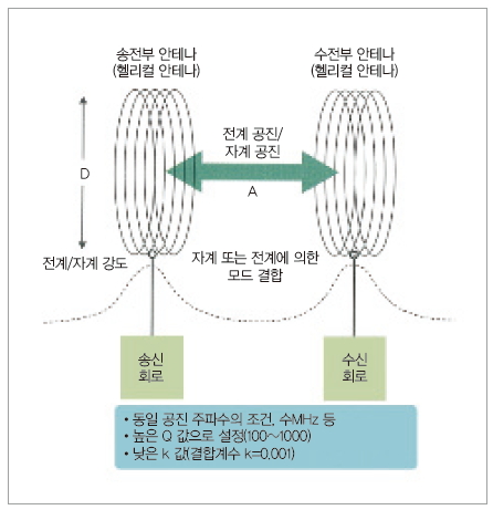 전자유도회로에 자기를 공진하기 위한 구동 코일이 추가된 방식으로 1~2m 정도의 무선전력전송 거리를 확보할 수 있고, 비교적 유도형에 비해 무선 송수전 안테나 정렬 범위가 유연하여 급전이나 충전시스템 구성에 있어 혁신적 편의성을 기대할 수 있다.