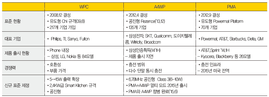 특히 또 하나의 상용화 기술을 갖고 있는 이스라엘 Powermat사와 미국의 Duracell사가 중심이 된 표준화 단체인 파워 매터스 얼라이언스(PMA : Power Matters Alliance)가 무선전력 표준의 글로벌 상호 운용성 확립을 위해 2014년 A4WP와 통합 협력을 체결한 바 있다.