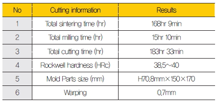 분말 재료는 레이저 소결 및 NC 가공 후 제품의 표면경도는 HRc 40 정도로 나타났다. 표 2에 제작된 캐비티 부품의 가공 결과를 나타냈다.