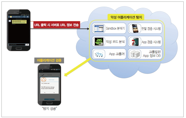 최근 스미싱을 통한 악성 어플리케이션 확산이 눈에 띄게 증가하여 문제가 되고 있다. 악성 URL 및 APK 파일을 전송하여 사용자로부터 개인 정보를 탈취하고, 이를 이용하여 2차 피해가 발생할 수 있다. 본 연구센터에서는 이를 방지하고자 클라우드 기반 안드로이드 악성 코드 및 URL 분석 플랫폼을 개발했다.