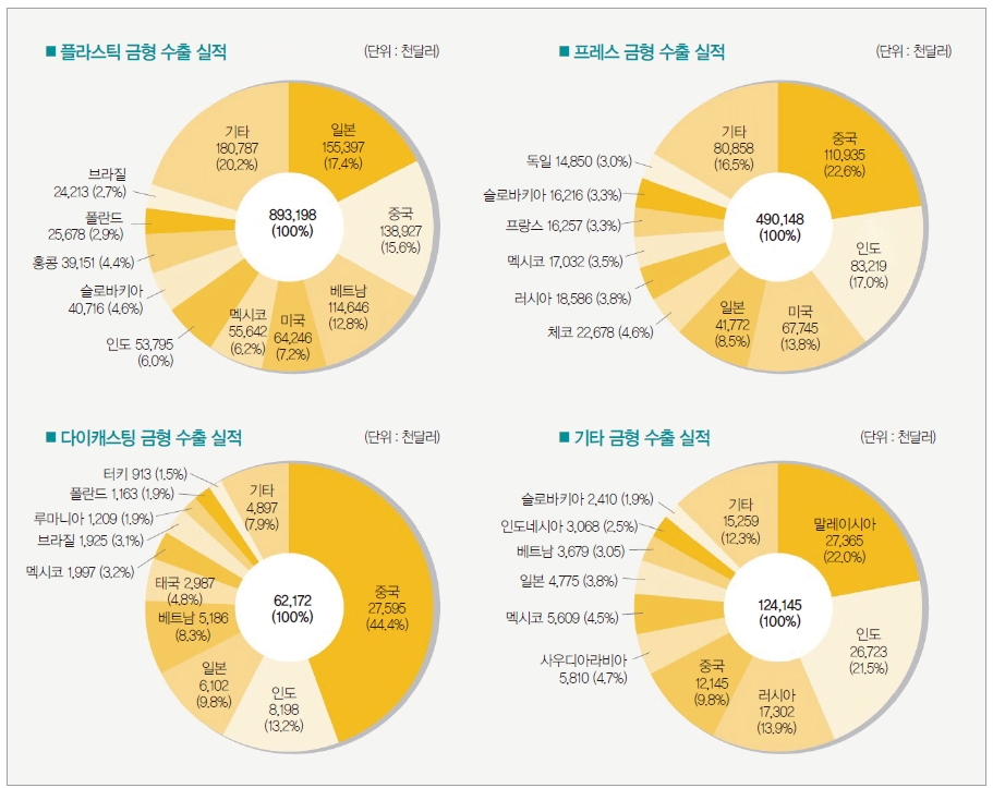 품목별로 수출 실적을 살펴보면 꾸준히 상승세를 보여 온 플라스틱 금형이 8억9,319만 달러의 실적을 나타내 9억5,459만 달러의 수출 실적을 보인 전년동기에 비해 6.4% 감소하여 전반적인 국내 금형 수출 감소 결과를 나타냈다. 특히 폴란드와 브라질의 폭발적인 수출 증가에도 불구하고, 우리나라 금형 교역에서 큰 비중을 차지하는 일본과 인도, 중국 수출의 부진으로 감소한 것으로 분석된다.